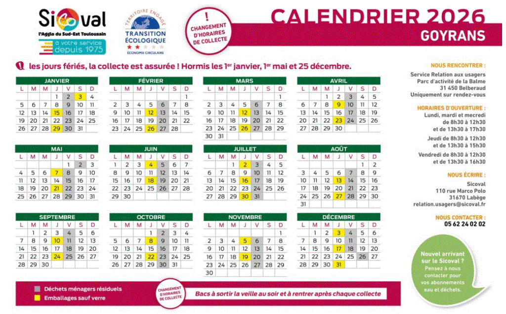 Le calendrier 2026 des collectes de déchets à Goyrans ainsi que des conseils sur le tri et la gestion des déchets est disponible ci-dessous :