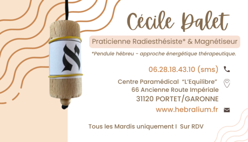 J’utilise différentes techniques de radiesthésie à visée thérapeutique et holistique, notamment le pendule hébreu en bois. Cette méthode ancestrale s’appuie sur les vibrations associées aux lettres hébraïques, utilisées pour identifier et réajuster les déséquilibres énergétiques.